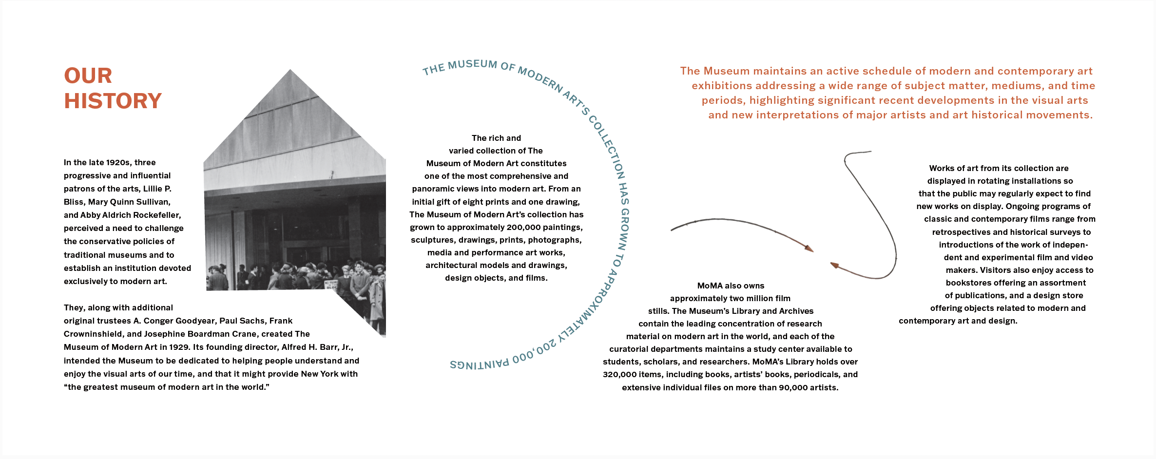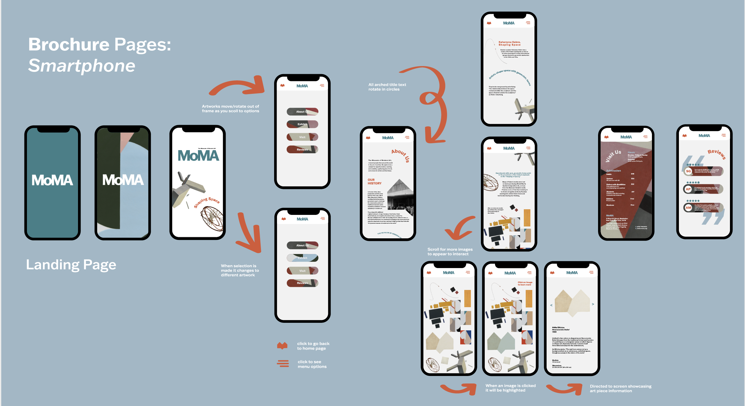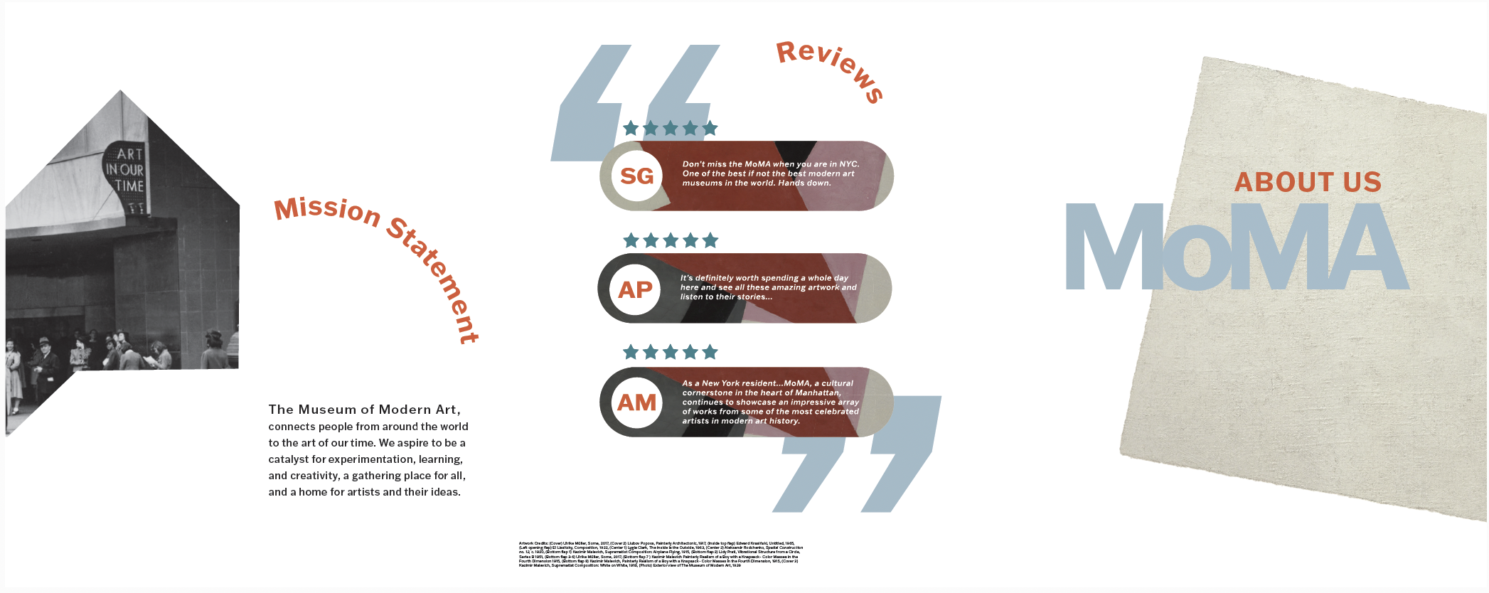 This project aims to design a comprehensive brochure and an interactive mobile app for a selected museum from three options provided. I have chosen The Museum of Modern Art (MoMA) to highlight the museum's history, exhibitions, and visitor information. The brochure will serve as a physical guide for guests, while the app will provide a more interactive experience that a brochure cannot achieve.