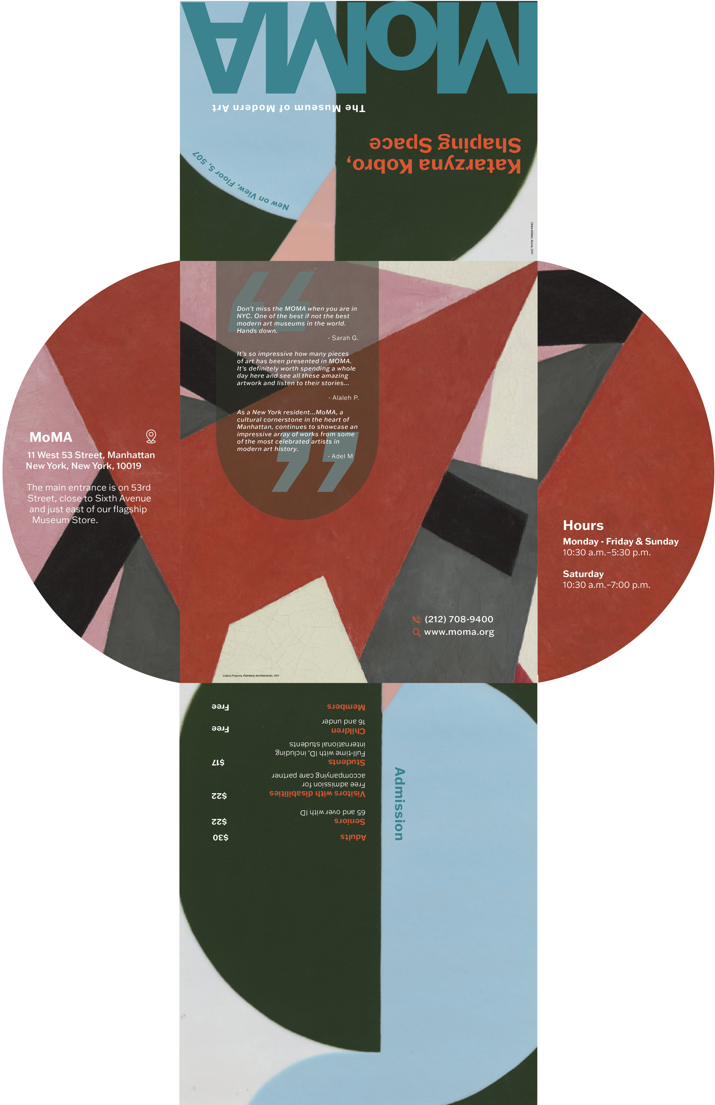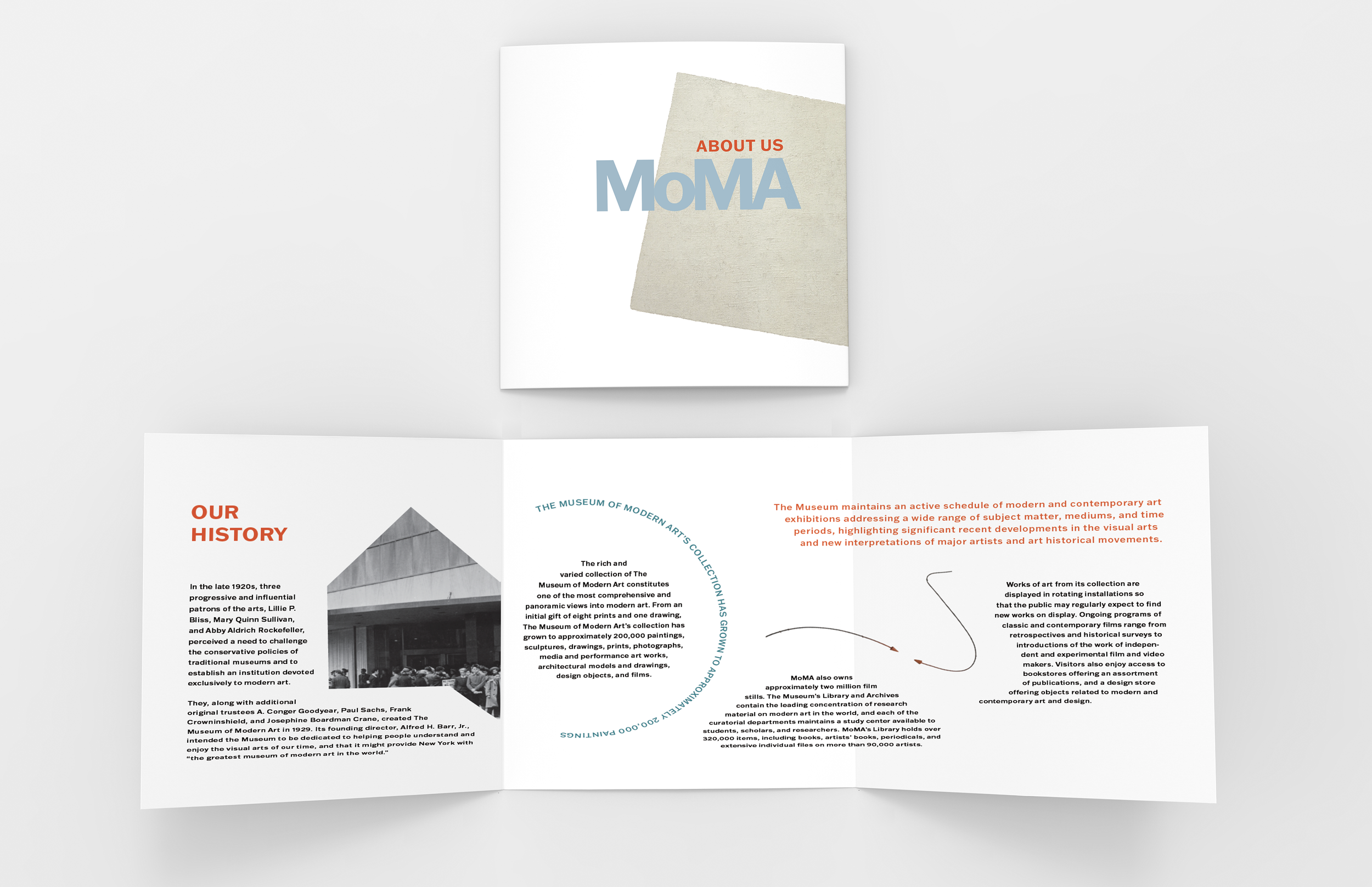 This project aims to design a comprehensive brochure and an interactive mobile app for a selected museum from three options provided. I have chosen The Museum of Modern Art (MoMA) to highlight the museum's history, exhibitions, and visitor information. The brochure will serve as a physical guide for guests, while the app will provide a more interactive experience that a brochure cannot achieve.